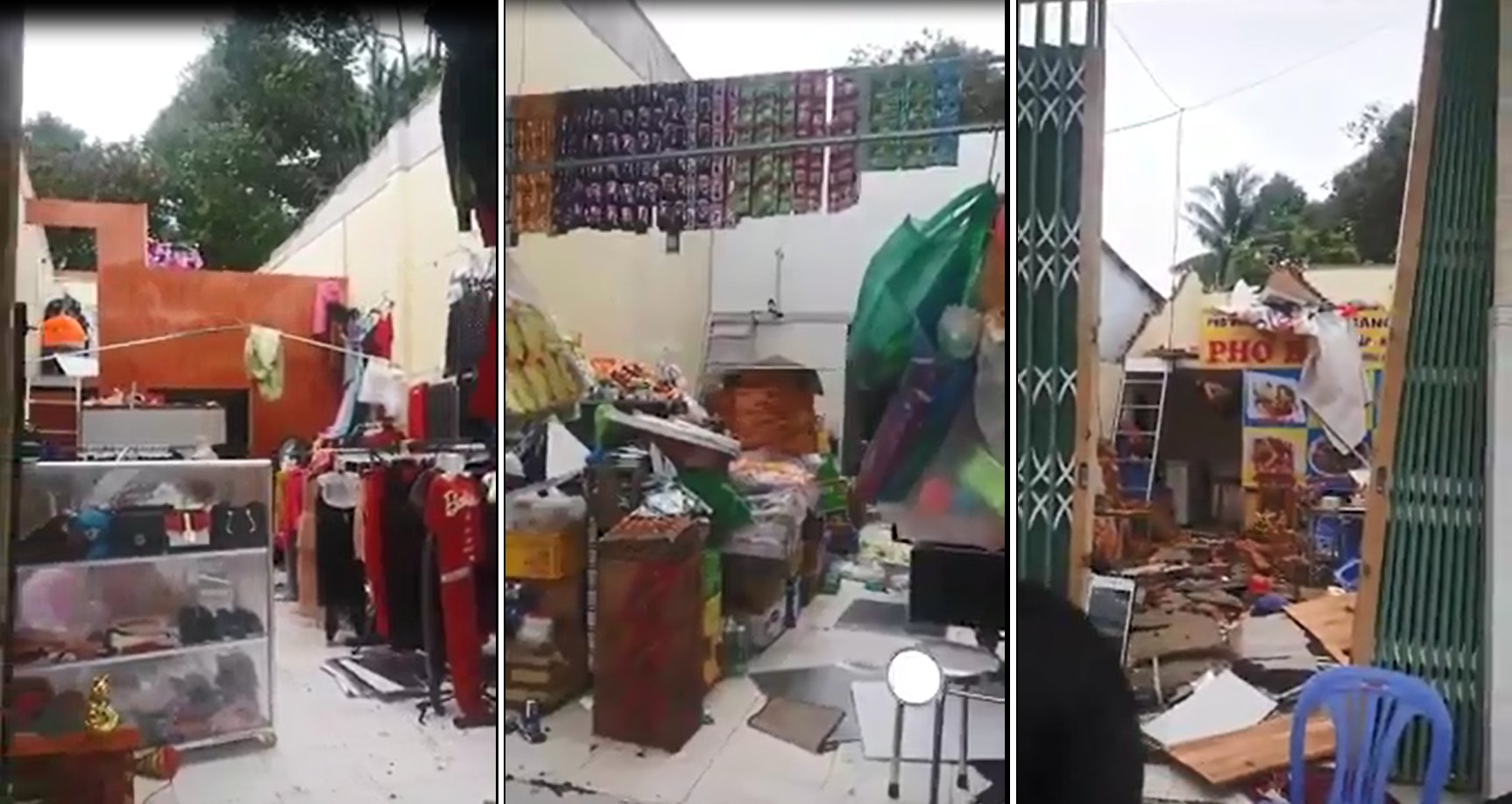 Clip dài 30 giây ghi lại hình ảnh cửa hàng bán quần áo, tạp hóa, đồ ăn của người dân tại Phú Quốc bị lốc xoáy thổi bay mái. Bên trong cửa hàng, bê tông ngổn ngang cùng với vật dụng sinh hoạt. Chủ cửa hàng đang bận rộn thu dọn hàng hóa của mình hạn chế tối đa thiệt hại do mưa bão gây nên.