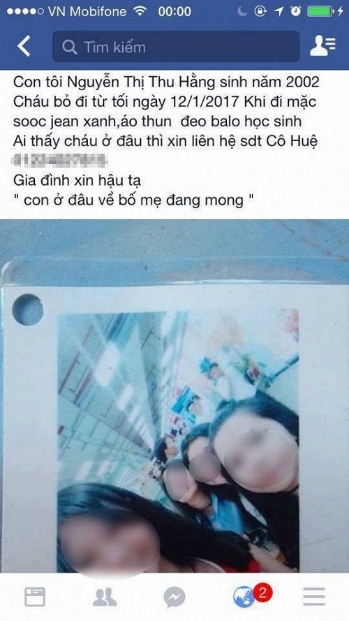 Không thấy Hằng về nhà, gia đình Hằng đăng tin lên các trang mạng xã hội tìm con.