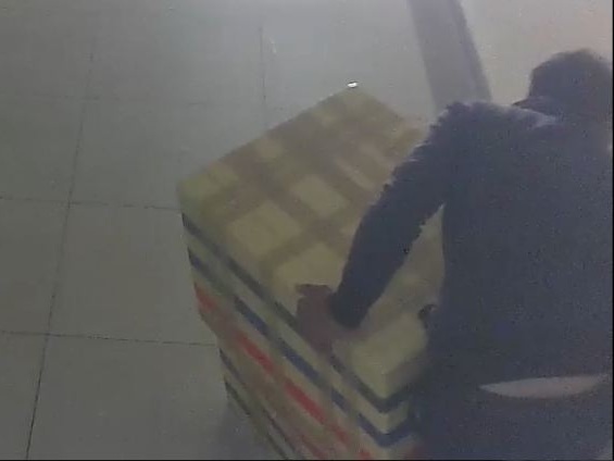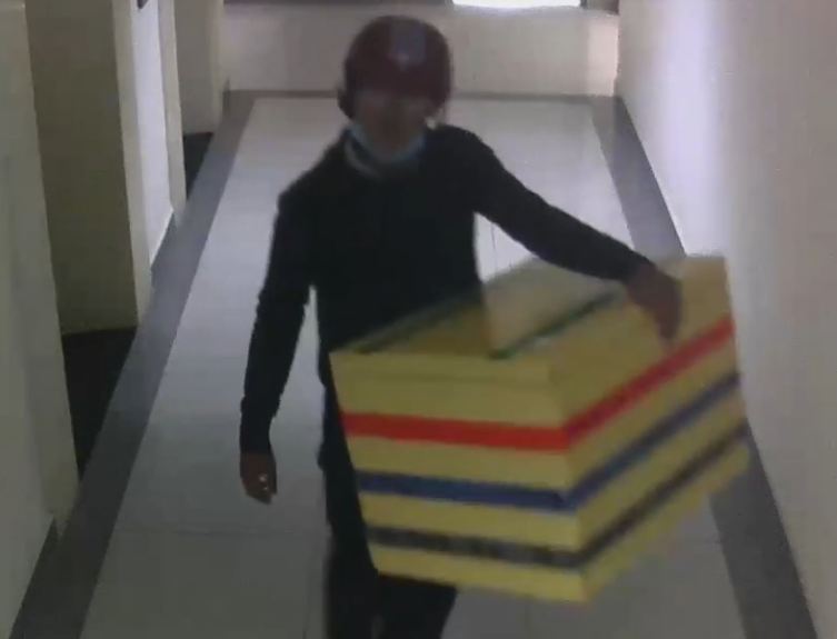 Hình ảnh từ camera an ninh cho thấy Bình mang thùng xốp lên chỗ giấu xác. Sau khi bỏ xác nạn nhân vào thùng định đưa đi tẩu tán thì bị bảo vệ tòa nhà phát hiện.