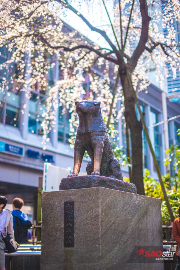 Tượng chú chó Hachiko nổi tiếng trước cửa ga Shibuya, xung quanh có một vài cây anh đào nhỏ.