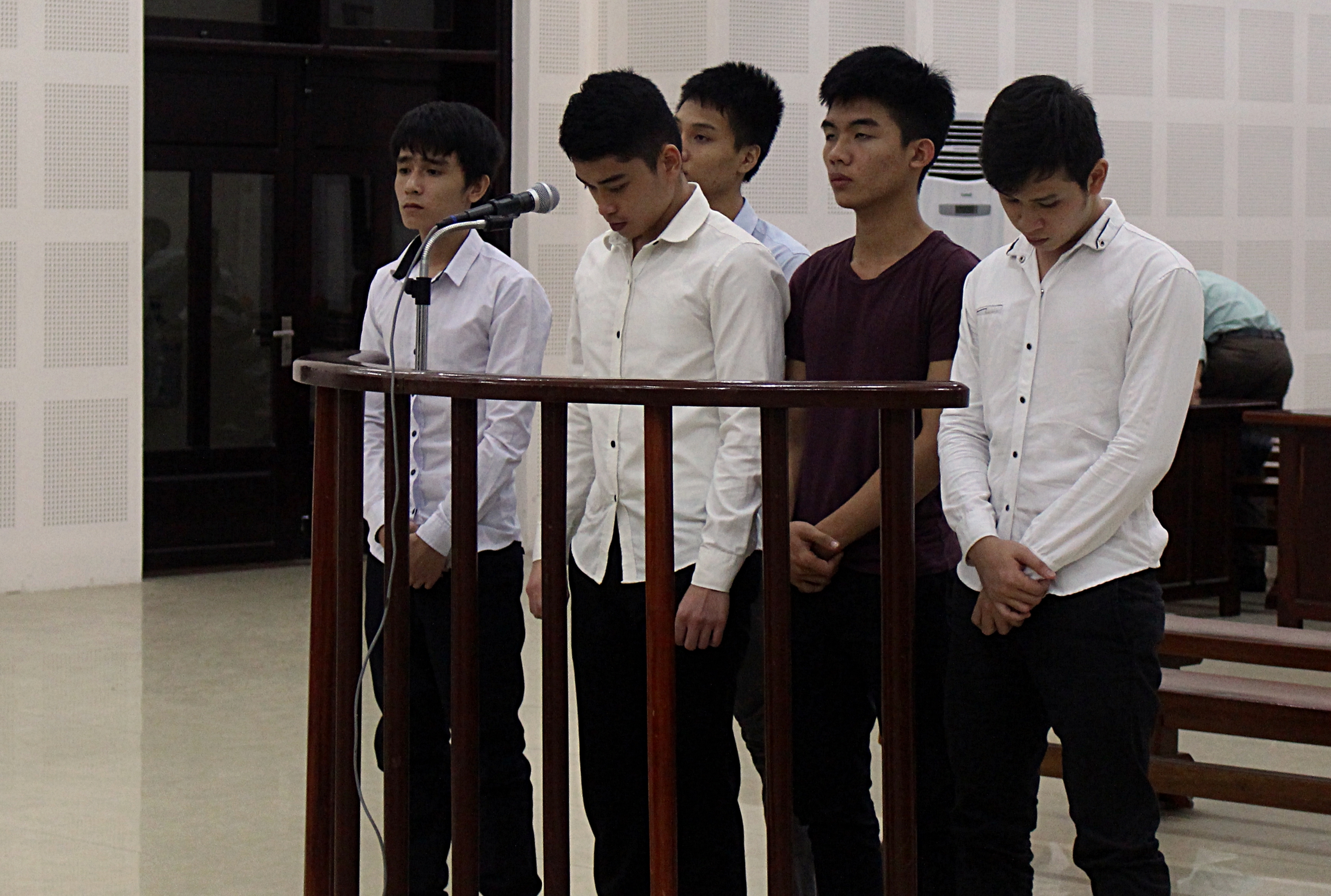 Các bị cáo cúi đầu hối hận tại phiên tòa.