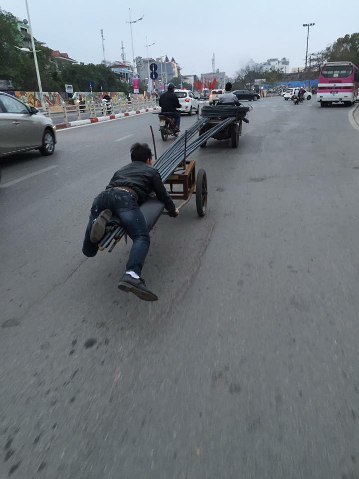 Chiếc xe chở sắt xây dựng, vì quá dài nên những người thồ sắt đã sáng tạo ra một “hệ thống” cân bằng có 1-0-2. Phần đuôi của những thanh sắt được đỡ bằng một chiếc xe 2 bánh nhỏ. Nam thanh niên nằm trên đống sắt đó đồng thời dùng tay đỡ càng của chiếc xe 2 bánh để giữ thăng bằng.