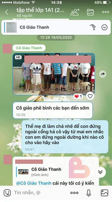 Cụ thể vào 13h28 ngày 19/5/2020, cô giáo Thanh gửi tin nhắn hình ảnh 7 em học sinh và nội dung “cô giáo phê bình các bạn đến sớm”. Sau đó, nhiều phụ huynh trong lớp đã nhắn phản hồi lại cô giáo và cho rằng, một số phụ huynh do công việc phải đi làm sớm và gửi con đến lớp sớm.