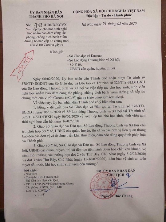 UBND TP Hà Nội đã đồng ý đề xuất của Sở Giáo dục và Đào tạo TP tại Tờ trình số 378 ngày 6/2/2020 và Sở Lao động Thương binh và Xã hội tại Tờ trình số 326 ngày 6/2/2020 về việc tiếp tục cho học sinh, sinh viên tạm thời nghỉ học đến hết ngày 16/2.