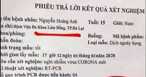 Sáng 4/2, Ban giám đốc Bệnh viện Đa khoa Lâm Đồng phát hiện trên mạng xã hội đang lan truyền “Phiếu trả lời kết quả xét nghiệm” dương tính virus corona của một bệnh nhân tên là Nguyễn Hoàng Anh, trong khi thực tế trên địa bàn tỉnh Lâm Đồng chưa có trường hợp nào dương tính với virus corona.