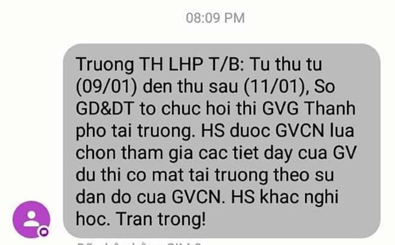 Cụ thể nội dung dòng tin nhắn nhà trường gửi tới phụ huynh học sinh như sau: “Trường tiểu học Lê Hồng Phong thông báo, từ thứ 4 (9.1) đến thứ 6 (ngày 11.1), Sở Giáo dục và Đào tạo tổ chức hội thi giáo viên giỏi thành phố cấp tiểu học tại trường. Học sinh được giáo viên chủ nhiệm lựa chọn tham gia các tiết dạy của giáo viên dự thi có mặt tại trường theo sự dặn dò của giáo viên chủ nhiệm. Học sinh khác nghỉ học. Trân trọng!”.