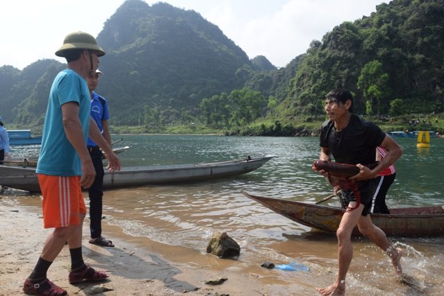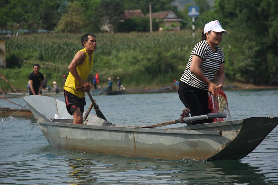 Có 6 đội thi, mỗi đội gồm 2 người vừa chèo thuyền qua sông vừa bắt cá, thôn Gia Tịnh bắt được nhiều cá trong thời gian sớm nhất. Còn con cá to nhất nặng 11kg thuộc về thôn Cù Lạc 1.