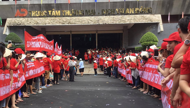 Từ 5 giờ ngày 19/9, hơn 2.000 tiểu thương trong trang phục áo đỏ đồng phục tập trung trước cổng chính chợ An Đông (trên đường An Dương Vương, Q.5), bãi thị.