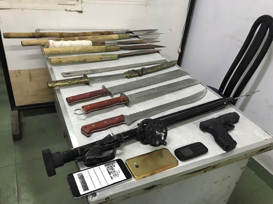 Tại hiện trường vụ hỗn chiến, lực lượng chức năng thu giữ nhiều hung khí, gồm: 3 đao cán gỗ dài 80 cm, 1 đao sắt dài 50 cm, 5 cây mác, 1 súng bắn cá, 1 súng bắn đạn bi, 1 dao xếp.