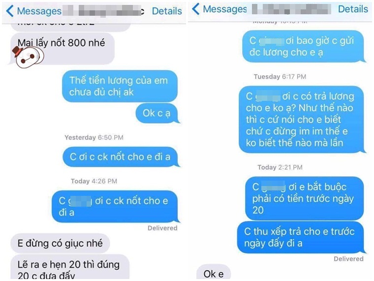 Một trường hợp khác cũng tố cáo cô nàng này nợ lương. Cụ thể một facebooker được G.C thuê làm admin với lương 2 triệu một tháng, nhưng 3 tháng lương vẫn chưa được thanh toán, đến khi đòi thì khất lần…