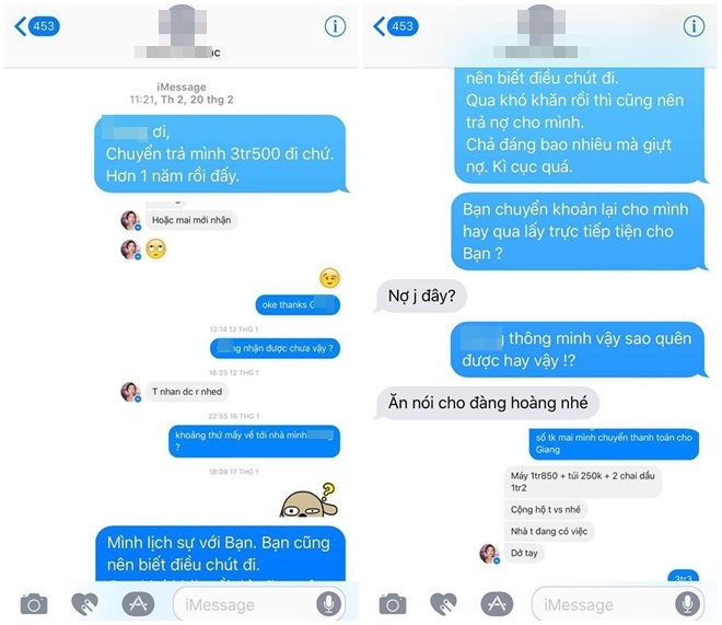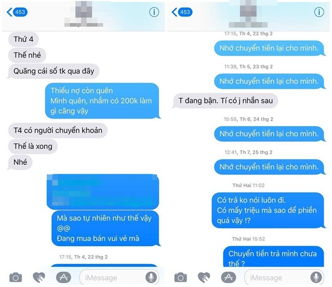 Facebook của bạn B.H có chia sẻ bài viết tố quỵt tiền kèm lời tố cáo: “Ác giả ác báo. Trước quỵt mình 5tr (5 triệu - pv) còn lên fb chửi với doạ đánh trong khi cũng gọi là 'thân'. Cuối cùng cũng có ngày này. Tin nhắn với bằng chứng mình vẫn có đủ nên đừng ai bảo ghen tức mà đổ oan. Chẳng qua không thích bóc phốt thôi. Biết ngay có người bóc hộ mà.”
