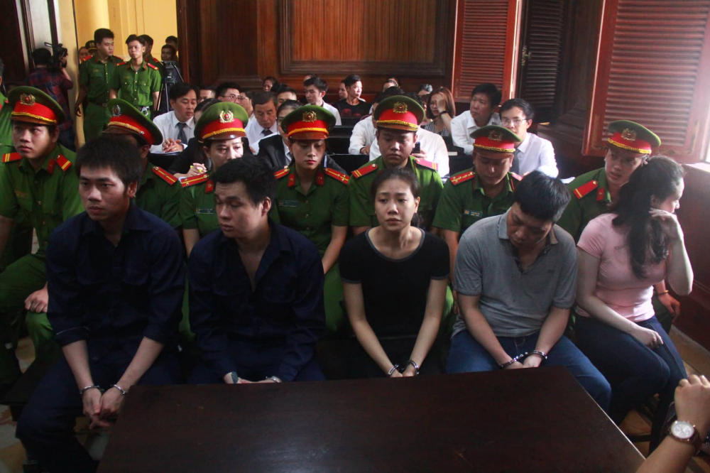 Phiên tòa diễn ra lúc gần 9h, các bị cáo được đưa vào trong phiên tòa, lực lượng công an bảo vệ nghiêm ngặt. Trong phiên tòa xét xử, Ngọc Miu ngồi hàng ghế đầu, liên tục đưa mắt nhìn các bị cáo khác rồi rơi nước mắt.