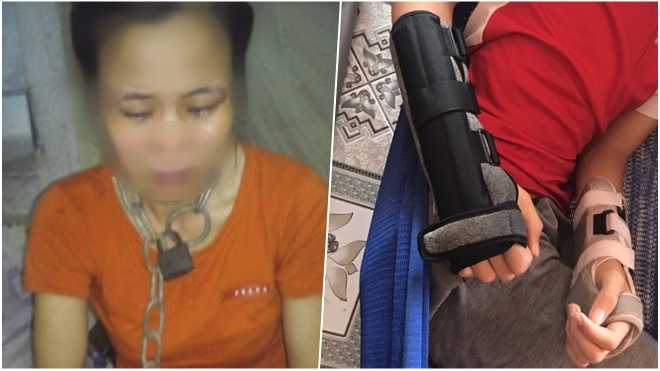 1. Người phụ nữ bị chồng vũ phu xích cổ, bẻ gãy tay con trai
