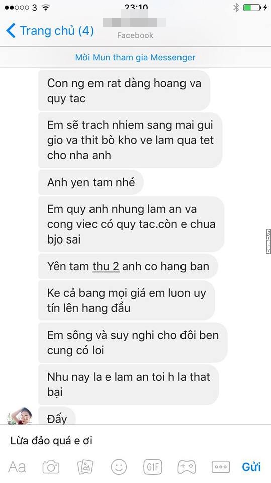 Mình gọi điện thì nó kêu bận, Facebook nhắn tin hỏi thì nó chặn mình, đổi tên Facebook xóa hết dấu vết nhưng mình đã kịp chụp lại tất cả làm bằng chứng.”