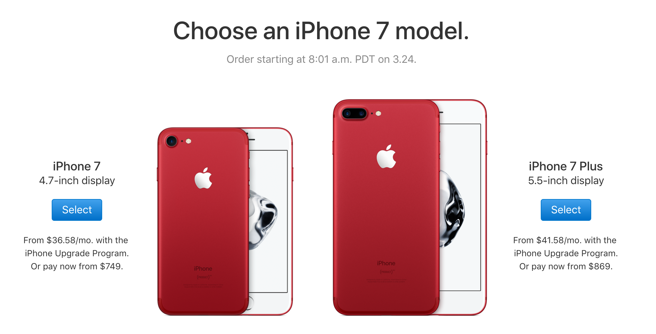 Đột ngột xuất hiện trên trang chủ Apple, với hai lựa chọn Iphone 7 và Iphone 7 Plus, phiên bản đặc biệt màu đỏ sẽ bắt đầu được đặt hàng từ 8:01 phút sáng 24/3/2017 theo giờ Mỹ đã khiến hàng loạt fan cuồng của chiếc điện thoại thông minh phổ biến nhất thế giới phải hoảng hốt.
