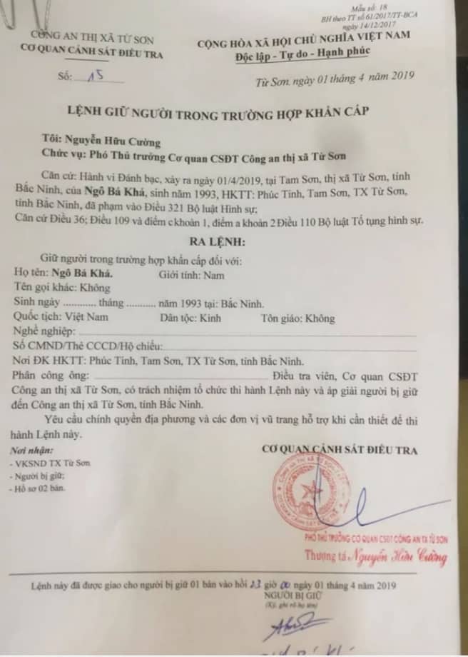 Ngày 2/4, Phòng Cảnh sát Hình sự Công an tỉnh Bắc Ninh cho biết, cơ quan điều tra đang làm rõ hành vi Ngô Bá Khá (26 tuổi, trú tại Từ Sơn, Bắc Ninh) tổ chức đánh bạc qua hình thức tổ chức đánh lô đề.