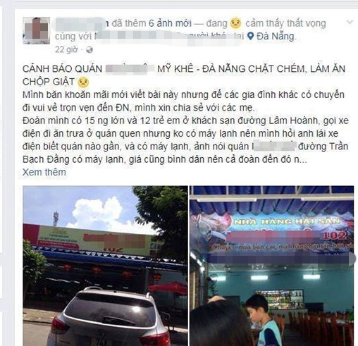 Ngày 23/7, trên trang Facebook cá nhân Cherry Hien đăng tải hình ảnh kèm bài viết cảnh báo mọi người về việc bị một quán ăn “chặt chém” khi cùng gia đình đi du lịch tại TP Đà Nẵng.