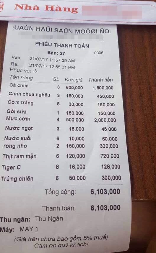 Theo thực khách này, quán báo giá cá chim “bé bằng cá rô” với giá 500.000 đồng/con nhưng tính tiền 600.000 đồng/con. Thịt rang 120.000 đồng/dĩa nhưng “lèo tèo vài miếng”. Canh chua nghêu 150.000 đồng đếm đúng 10 con nghêu. Sau khi tính tiền, mọi người nghẹn ngào khi thấy tổng hóa đơn hơn 6 triệu đồng.