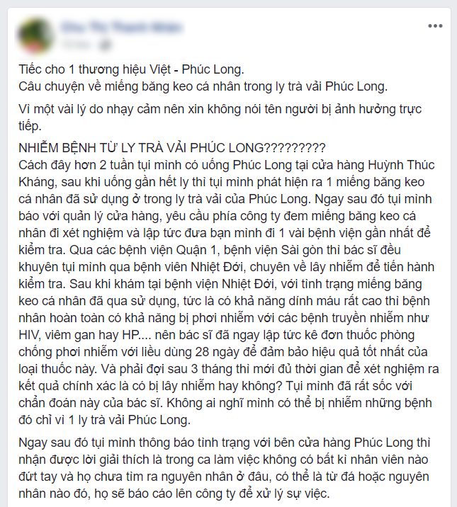 Cụ thể, tài khoản C.T.T.N chia sẻ trên trang cá nhân: “Cách đây hơn 2 tuần tụi mình có uống Phúc Long tại cửa hàng Huỳnh Thúc Kháng, sau khi uống gần hết ly thì tụi mình phát hiện ra 1 miếng băng keo cá nhân đã sử dụng ở trong ly trà vải của Phúc Long.