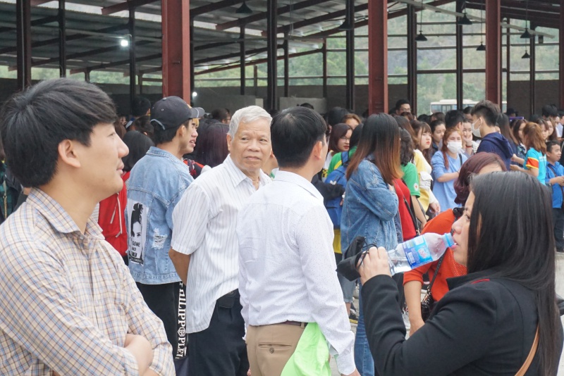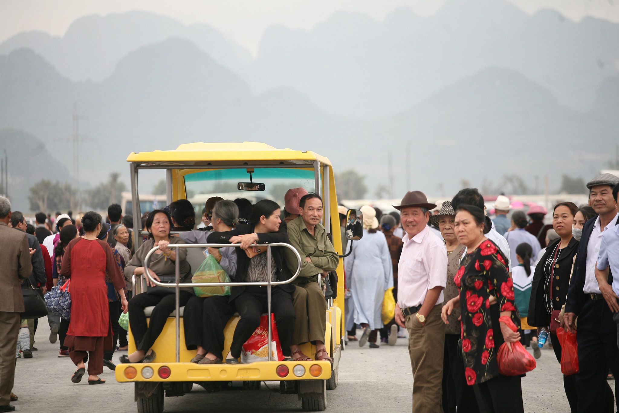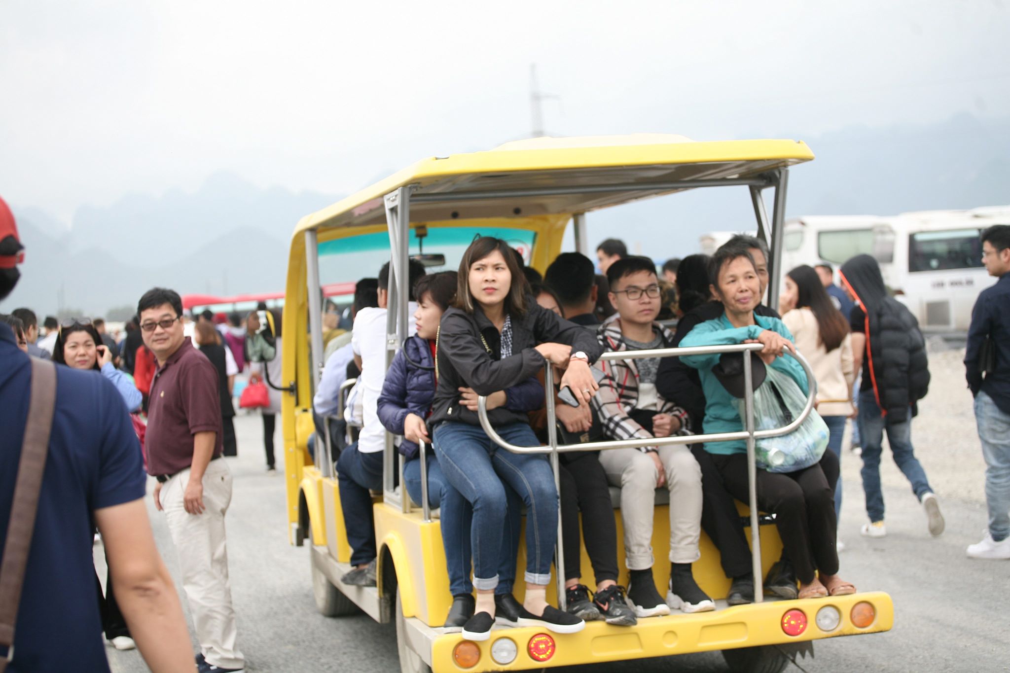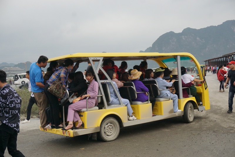 Vì ngày khai hội chùa Tam Chúc nên ban quản lý không thu phí đi xe điện. Khi có xe nhiều người vội vã chạy lên tìm cho mình một vị trí.
