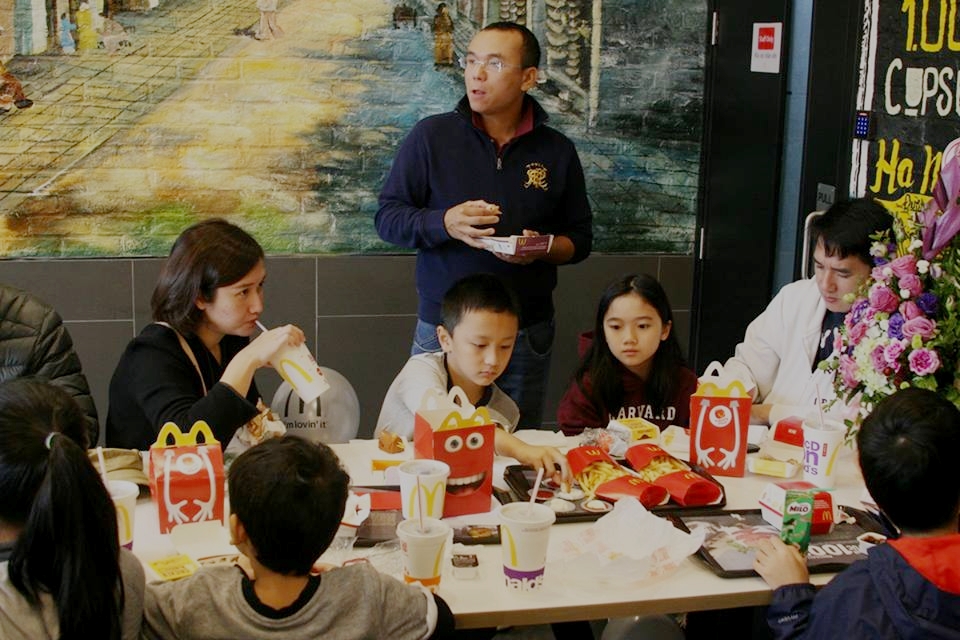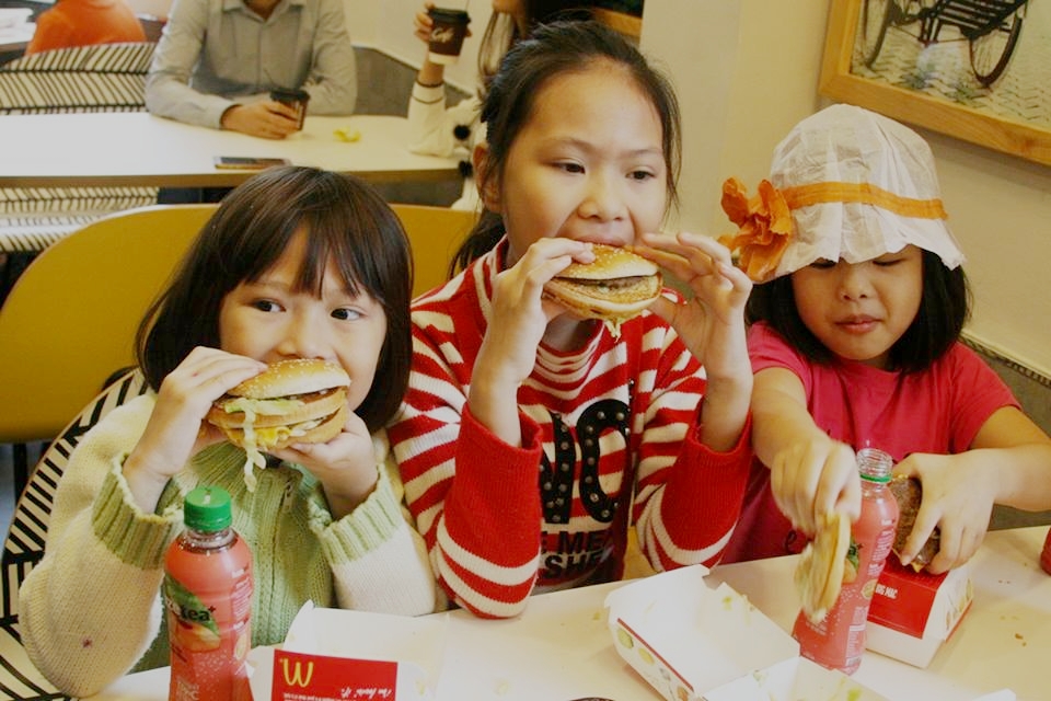 Cả gia đình cùng đến McDonald's thưởng thức đồ ăn nhanh.