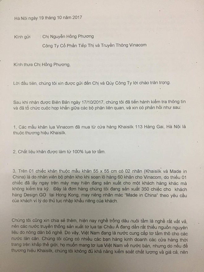 Sau khi nhận được phản ánh từ khách hàng, đại diện cửa hàng Khaisilk đã lên tiếng giải thích là do soạn nhầm lô hàng đính mác made in China. Theo đó, người này cũng đã gửi thư xin lỗi đến doanh nghiệp về sự nhầm lẫn này và cho biết số khăn lụa này nằm trong số 350 chiếc khăn sản xuất cho khách hàng khác ở Hong Kong.