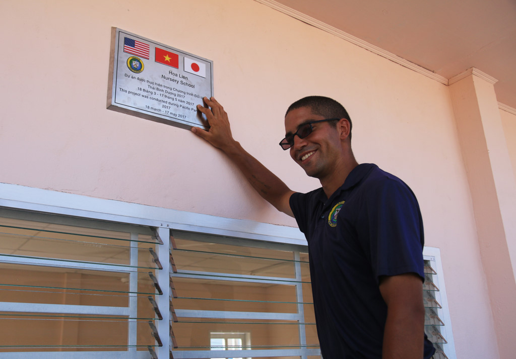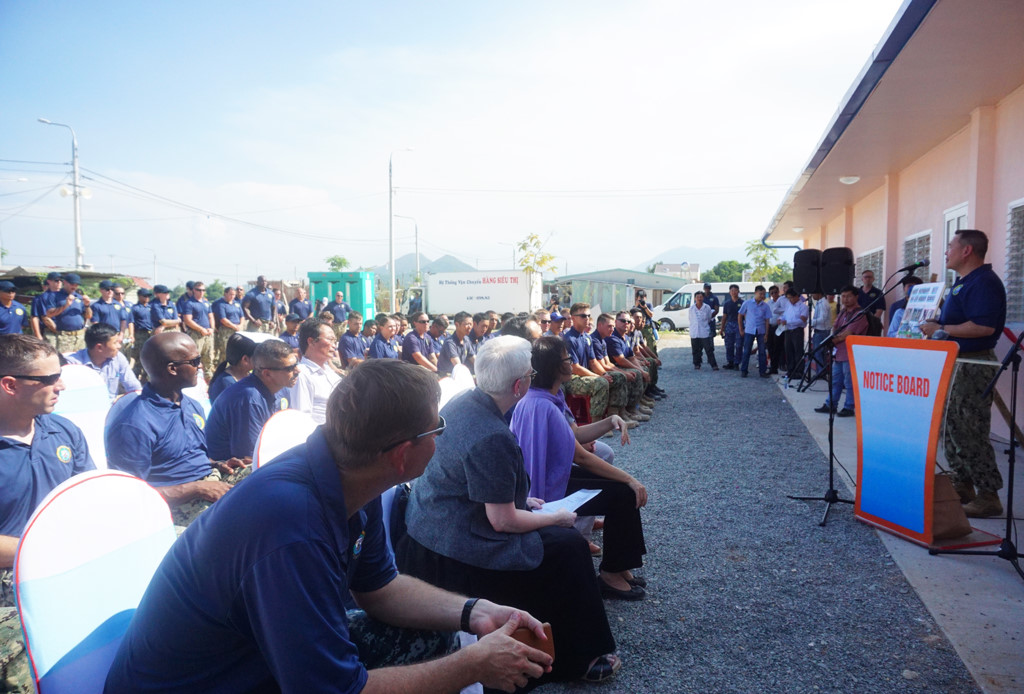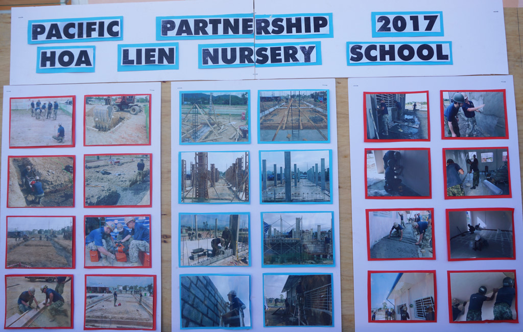 Sau đó, hải quân Mỹ đã trực tiếp gắn bảng dự án lên ngôi trường trong sự chứng kiến của người dân và chính quyền địa phương. Đây là công trình thể hiện mối quan hệ ngoại giao của 3 nước Việt Nam, Mỹ và Nhật Bản.