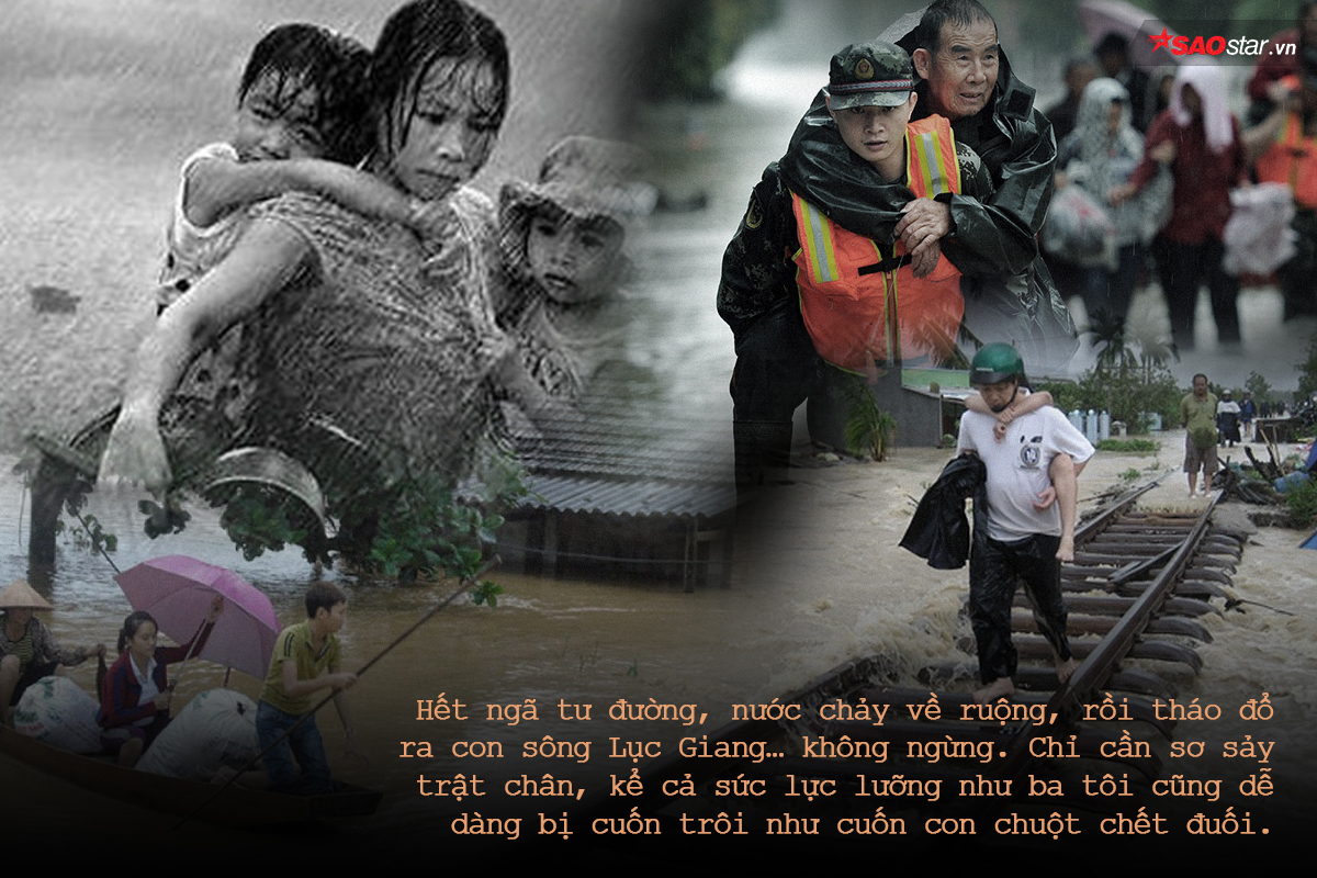 Đoạn đường qua nhà cô Hồng, hằng ngày tôi vẫn chạy nhảy, chơi nhảy dây, banh đao, năm mười. Hôm nay chỉ còn một màu nước đen sóng sánh. Qua khỏi sân nhà, xuống bục đường là thụt chân những nửa mét, nước càng dữ hơn. Hết ngã tư đường, nước chảy về ruộng, rồi tháo đổ ra con sông Lục Giang sau nhà… không ngừng. Chỉ cần sơ sảy trật chân, kể cả sức lực lưỡng như ba tôi cũng dễ dàng bị cuốn trôi như cuốn một con chuột chết đuối.