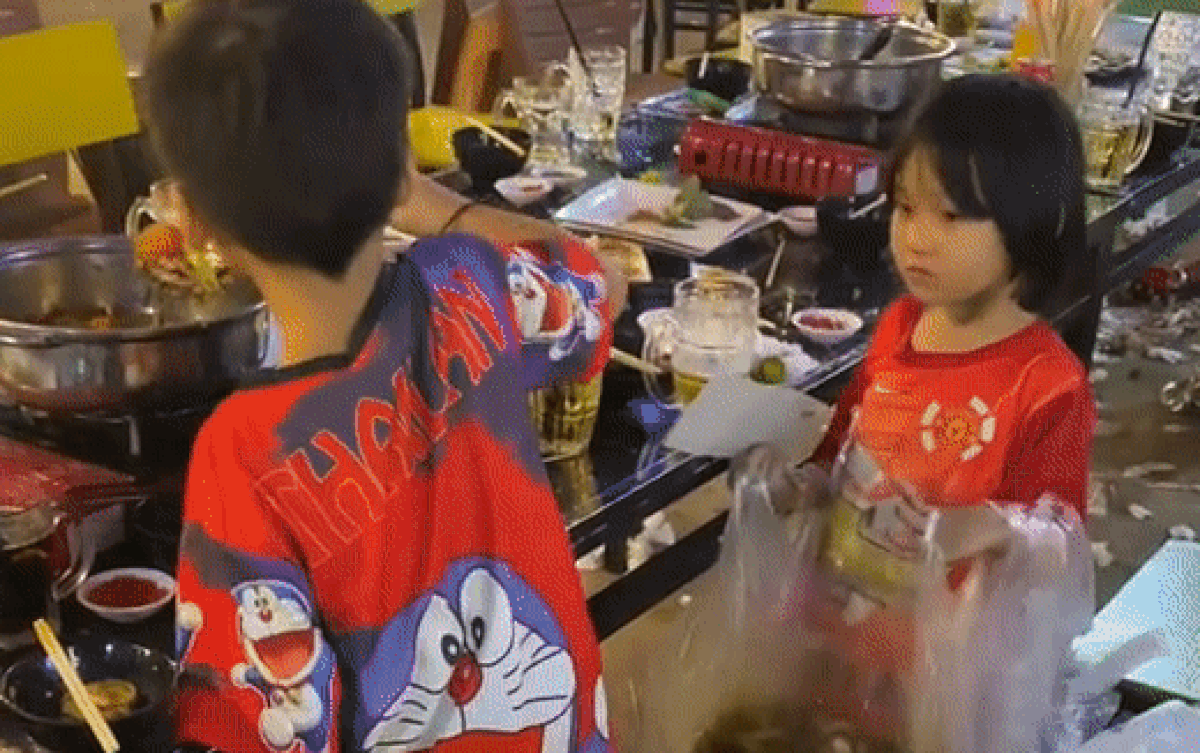 Theo đó, 2 em nhỏ với dáng vẻ khắc khổ đến một quán ăn, thấy bàn tiệc khách đã ăn xong và rời đi nhưng vẫn còn thức ăn thừa, 2 em nhỏ liền xin chủ quán để lấy đi số thức ăn thừa ấy.