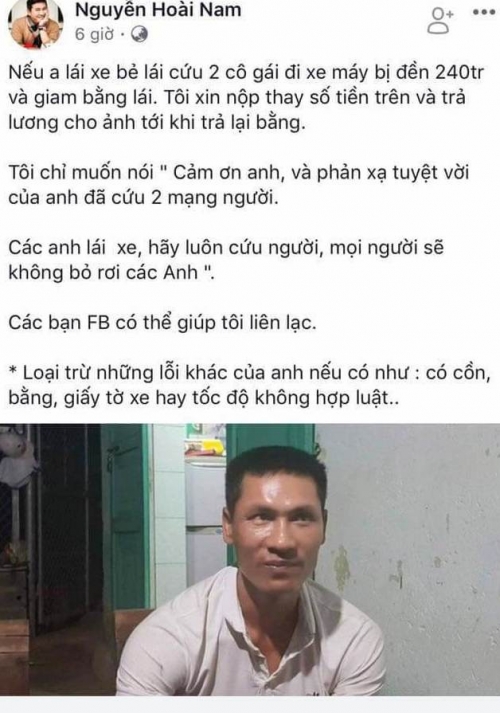 Trước đó, ngày 2/4, mạng xã hội liên tục chia sẻ về dòng trạng thái của doanh nhân trẻ Nguyễn Hoài Nam hứa sẽ nộp thay số tiền 240 triệu đồng cho tài xế xe tải có cú đánh lái xuất thần tránh tai nạn thương tâm cho 2 nữ sinh.