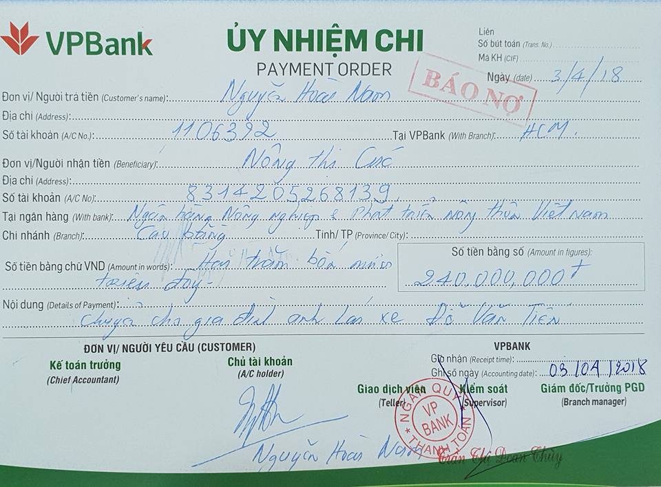 Số tiền 240 triệu đồng đã được chuyển tới tài khoản của vợ anh Tiến. (Ảnh trên trang cá nhân của doanh nhân Nguyễn Hoài Nam).