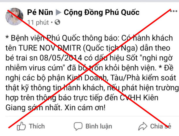 Cụ thể, một tài khoản Facebook Pé Nũn lên trên mạng Cộng đồng Phú Quốc, đưa thông tin “Bệnh viện Phú Quốc thông báo: có hành khách tên TURE NOV DMITR (quốc tịch Nga) dẫn theo bé trai… có dấu hiệu sốt 'nghi ngờ nhiễm virus cúm' đã bỏ trốn khỏi bệnh viện. Đề nghị các bộ phận kinh doanh, tàu/ phà kiểm soát thật kỹ thông tin hành khách, nếu phát hiện trường hợp trên thông báo trực tiếp đến CVHH (cảng vụ hàng hải - PV) Kiên Giang sớm nhất. Xin cám ơn! “