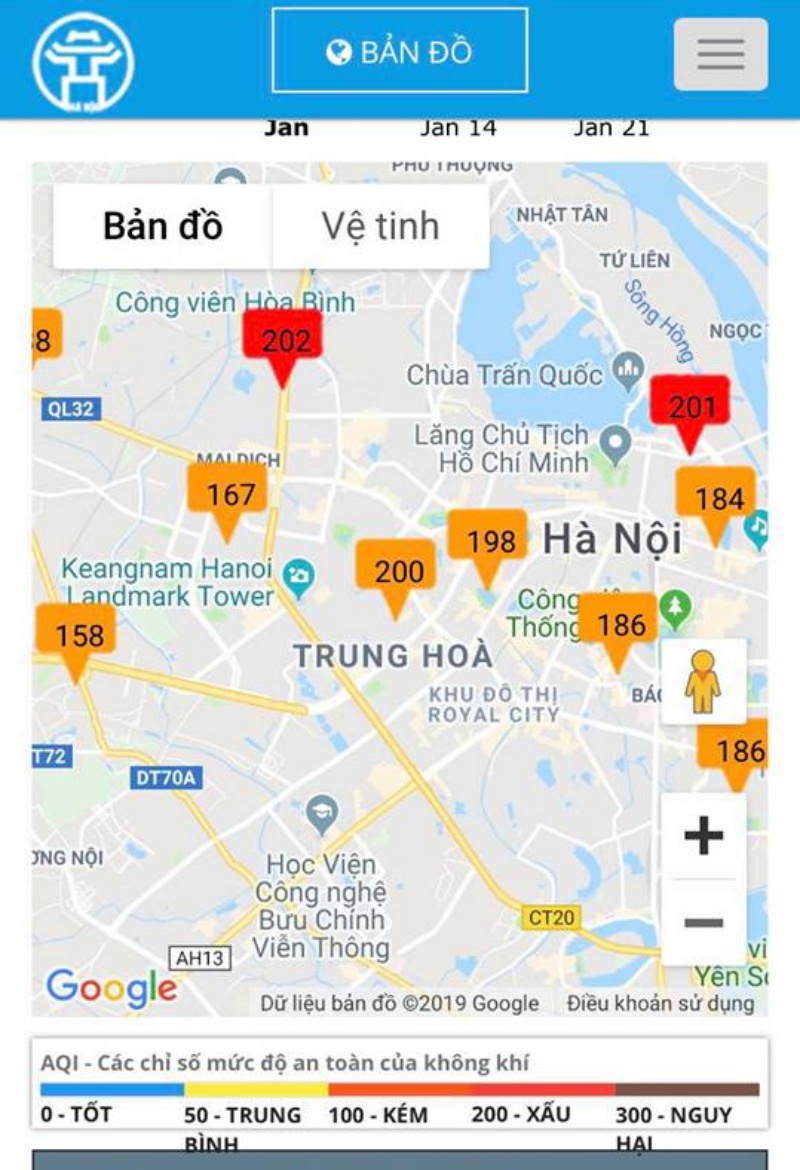 Điểm đo Phạm Văn Đồng đo được chỉ số AQI PM 2.5 lên tới 400, một chỉ số mà theo đánh giá của giới chuyên gia là hiếm khi lên tới. Điểm đo Mỹ Đình, chỉ số AQI PM 2.5 cũng lên tới hơn 300, điểm đo tại Chi cục Bảo vệ Môi trường Hà Nội cũng lên tới 400. Ở một số điểm đo khác, chỉ số bụi AQI PM 2.5 cũng tiệm cận mức nguy hại.