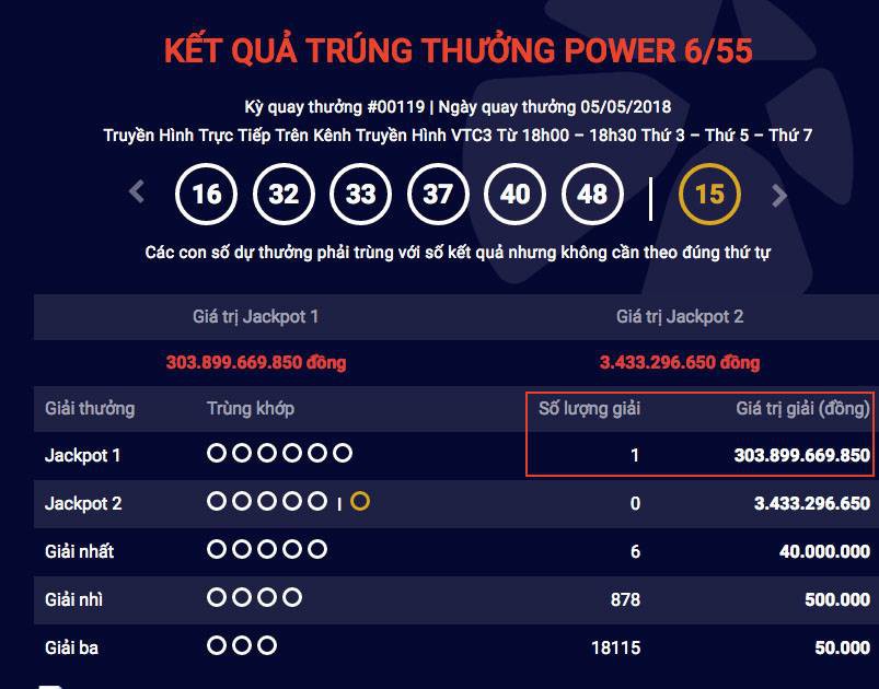 Ngày 5/5, kỳ quay thứ 119 của loại hình xổ số tự chọn Power 6/55 đã tìm ra người may mắn trúng giải Jackpot 1 trị giá 303.899.669.850 đồng, với dãy số may mắn 16-32-33-37-40-48.