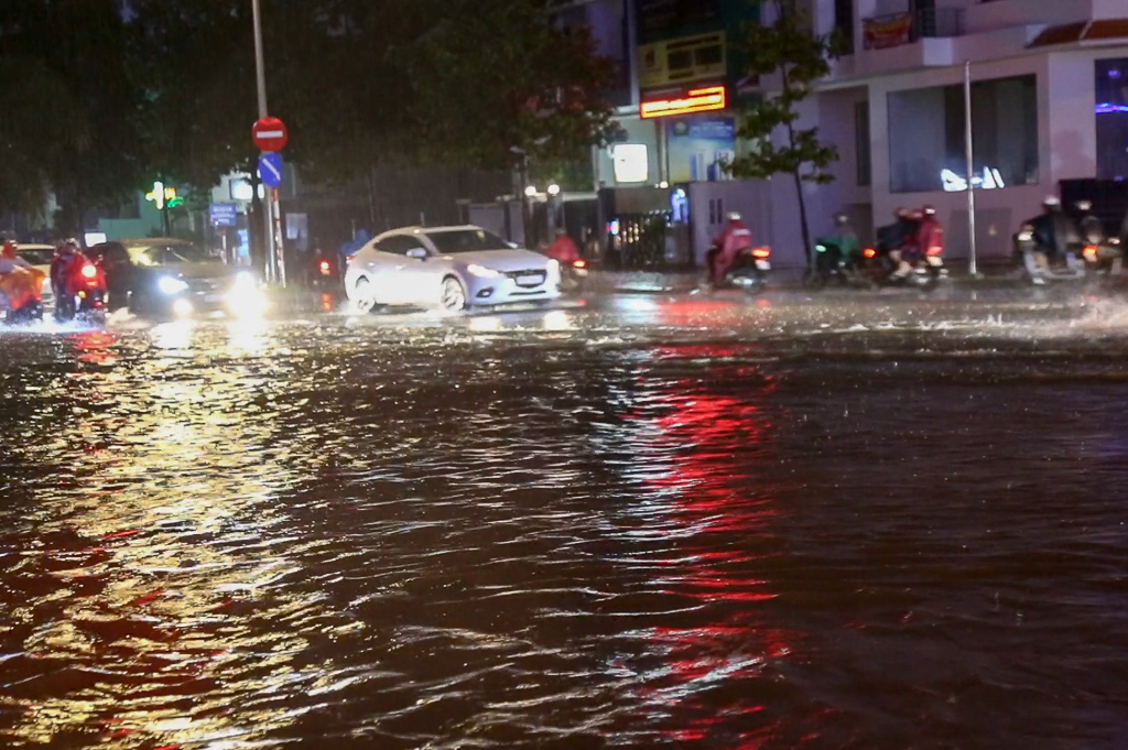 Dọc các trục đường thuộc khu vực quận 7, nước ngập sâu khiến giao thông qua khu vực này gặp rất nhiều khó khăn, hỗn loạn. Mưa lớn kèm sấm chớp khiến cũng khiến một khu phố nhà giàu tại đây chìm trong biển nước. Tại các tuyến đường nội đô của khu dân cư Him Lam gần như tê liệt vì nước ngập sâu gần đầu gối của người lớn.