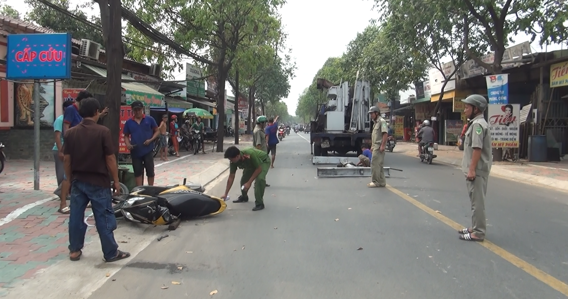 Lúc này, chị H. đang điều khiển xe máy mang BKS 59N2-484xx chạy hướng ngược lại thì bị khung sắt va trúng khiến chị H. cùng xe máy ngã xuống đường, bị thương.