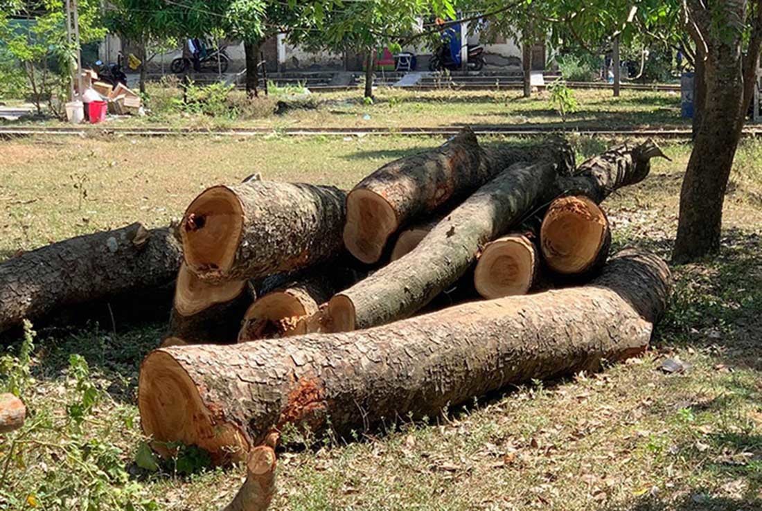 Gỗ cây xà cừ bị chặt được tập kết trong khuôn viên