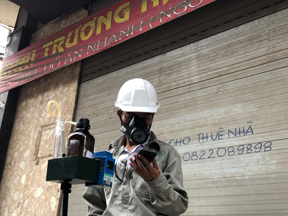 Các kỹ sư thuộc Chi cục Bảo vệ môi trường - Sở Tài nguyên và Môi trường Hà Nội đã đến phố Hạ Đình - nơi xảy ra cháy tại Công ty Cổ phần Bóng đèn Phích nước Rạng Đông để đo chất lượng không khí.