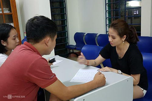 Vũ Ngân (phải) ghi lời khai khi bị bắt vì vận chuyển ma tuý. Ảnh: Công an Quảng Trị.