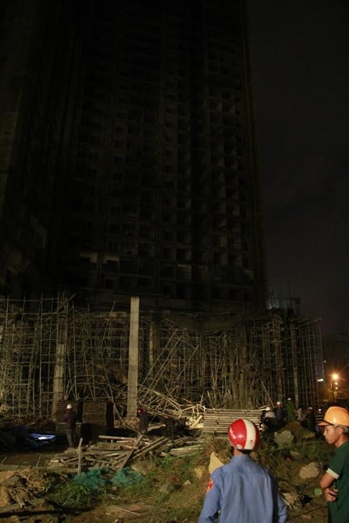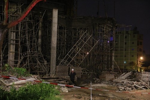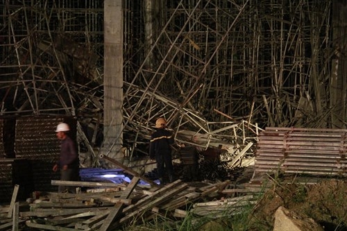 Tại hiện trường, một phần lớn giàn giáo phục vụ việc đổ dầm bê tông đổ ngổn ngang, xiêu vẹo. Nhiều trụ lớn cũng bị xô lệch.
