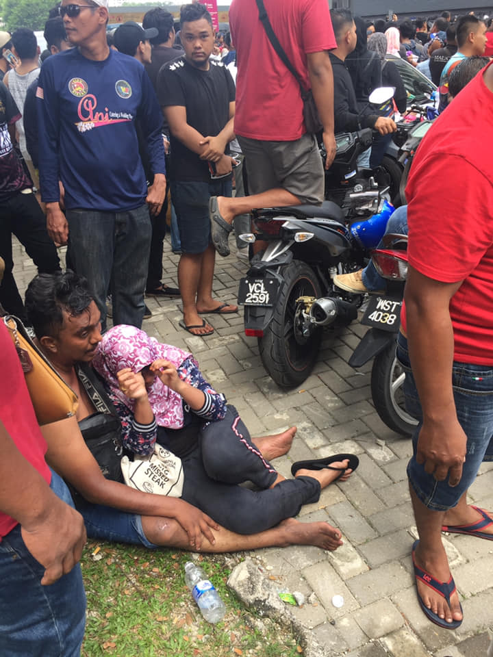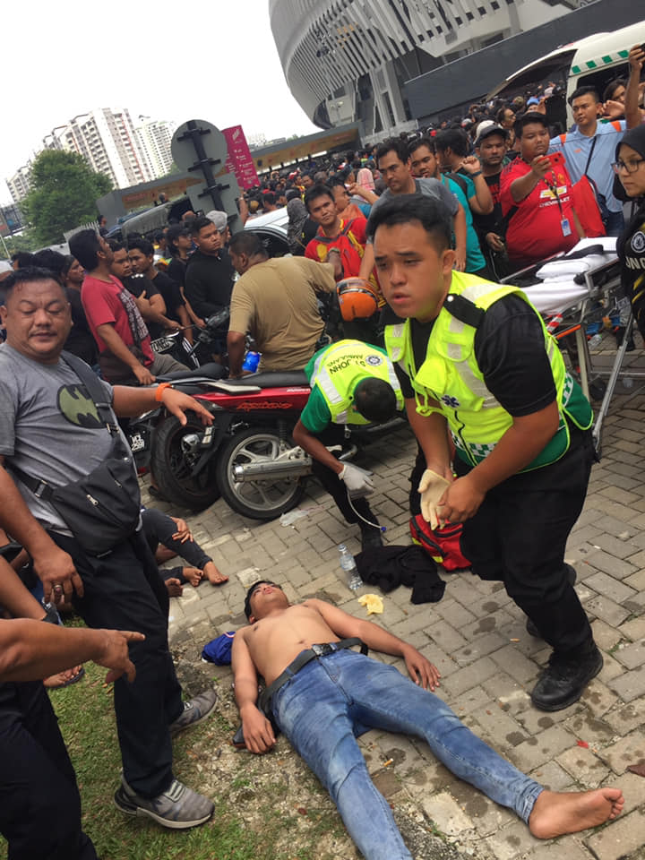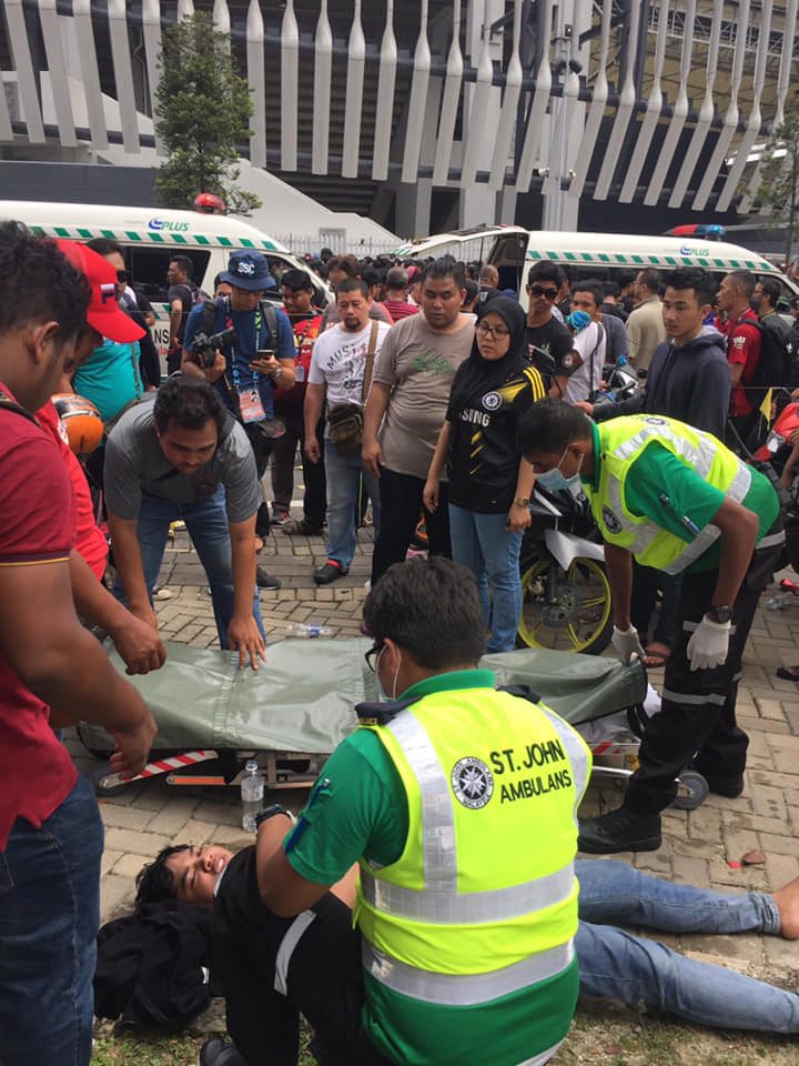 Một CĐV ngất xỉu ngay tại chỗ, bên cạnh một vài chiếc chiếu bị bỏ lại của người hâm mộ bóng đá. Ảnh New Strait Times