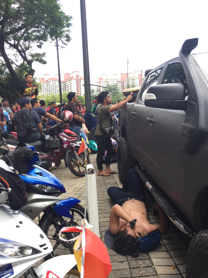 Một nam CĐV Malaysia ngất xỉu bên cạnh ô tô. Ảnh BEAT.VN