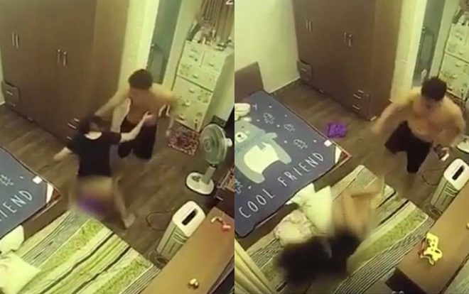 Hình ảnh người đàn ông đạp đá đánh dã man vợ tại nhà.