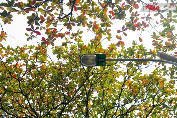 Hình ảnh ấn tượng được ghi lại trên phố Cửa Đông, với hàng tầng lá bàng bao trùm lên các bóng đèn cột điện cao áp.