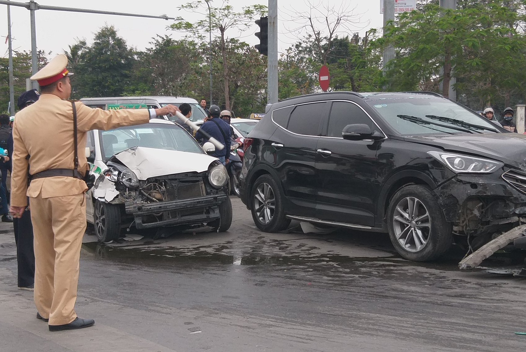 Phía trước chiếc xe taxi là chiếc xe Santafe với phần đầu bị móp méo, hư hỏng. Một chiếc xe máy Wave màu đỏ cũng bị cuốn vào gầm ô tô. Ngay sau khi xảy ra sự việc lực lượng chức năng đã nhanh chóng có mặt tại hiện trường.