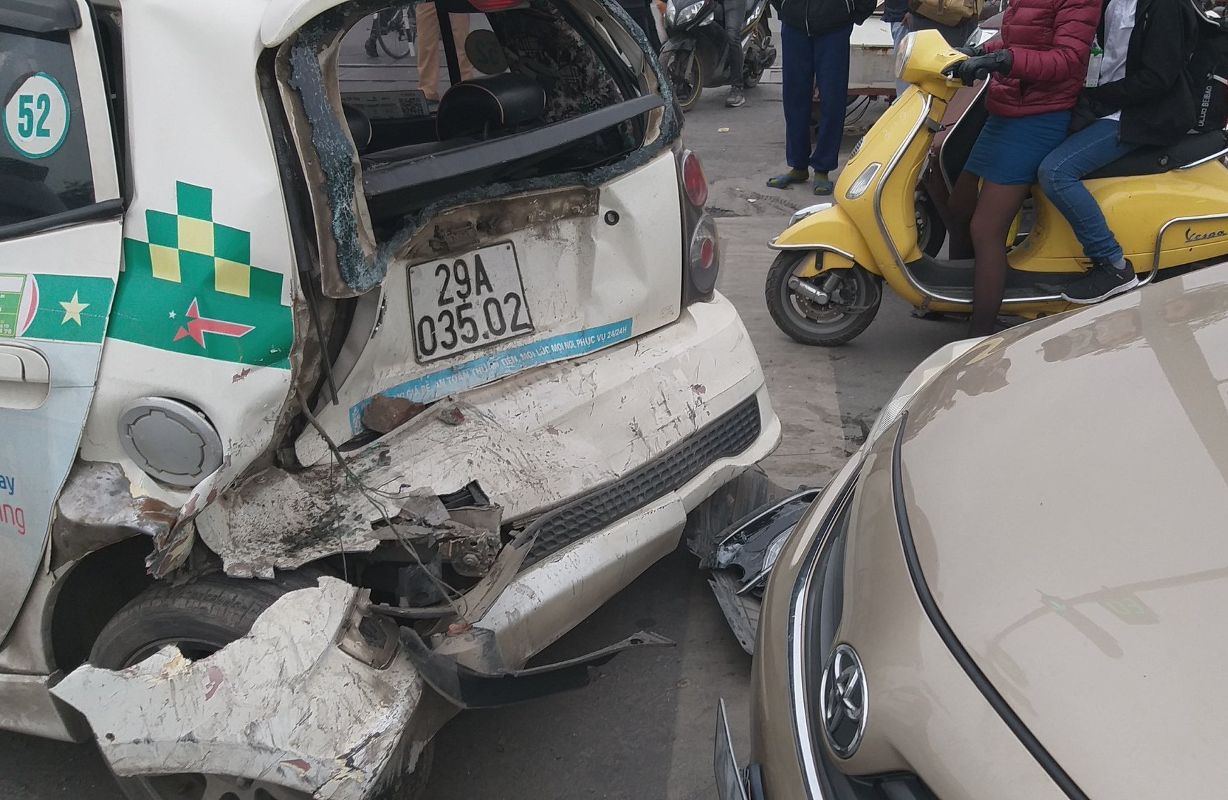 Tại hiện trường, nhiều mảnh vỡ từ các xe xảy ra va chạm vương vãi khắp nơi. Nặng nhất là chiếc taxi. Phía sau xe bị hư hỏng nặng, kính vỡ tan, phần thân bên lái móp méo.