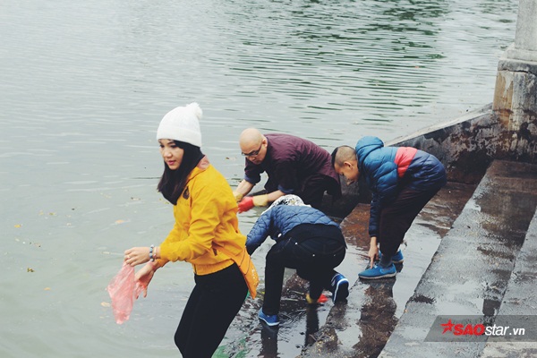 Nhà sư Thích Tịnh Giác (trụ trì chùa Trúc Sơn, Gia Lâm, Hà Nội) cùng đệ tử và một số bạn trẻ rửa sạch bãi lên xuống ở Hồ Tây.