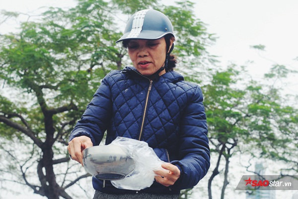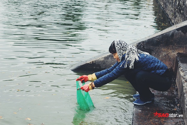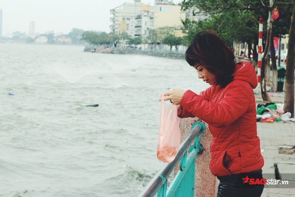 Bà Bình (Xuân La, Tây Hồ) nâng những con cá chép rất cẩn thận trước khi thả.