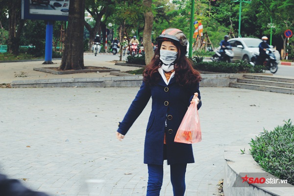 Cô gái trẻ này một tay cầm túi bóng đựng cá chép vàng, một tay cầm điện thoại đọc lại bài cúng.