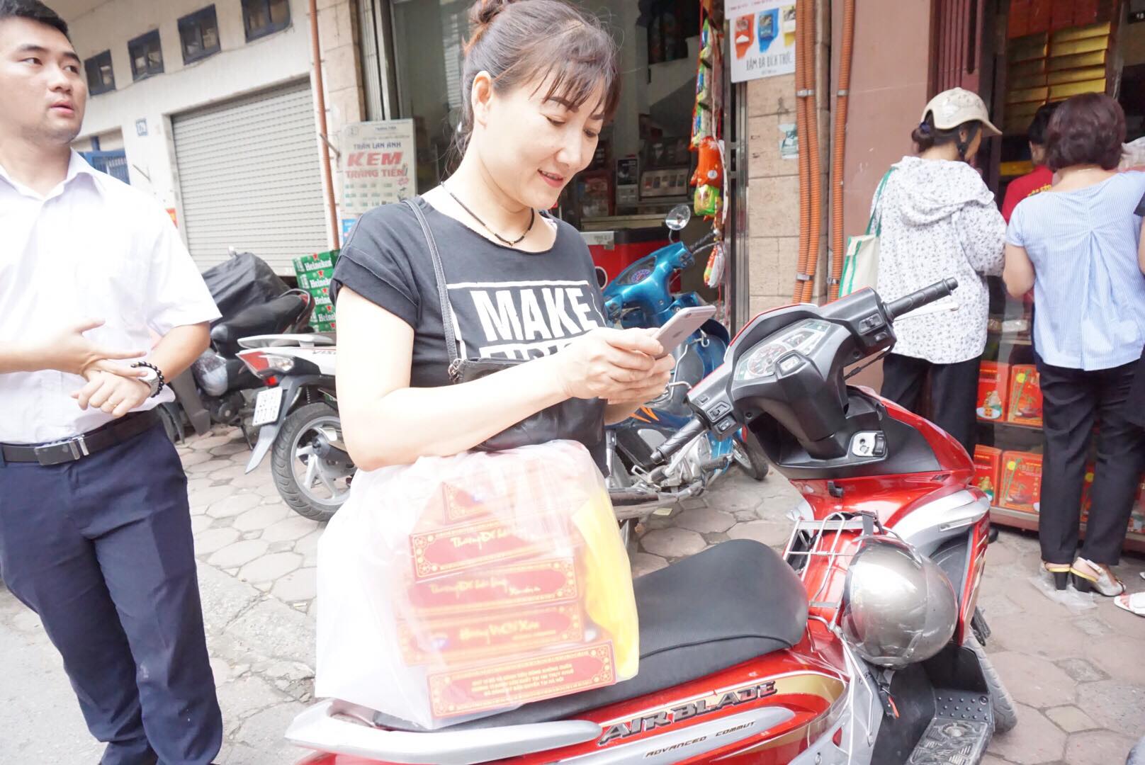 Cô Thanh (ở phường Khương Trung, quận Thanh Xuân) được con gái chở đến đây mua bánh trung thu. Sau một hồi lâu xếp hàng cô cũng mua được những hộp bánh cả gia đình thích mỗi dịp Trung thu cận kề.